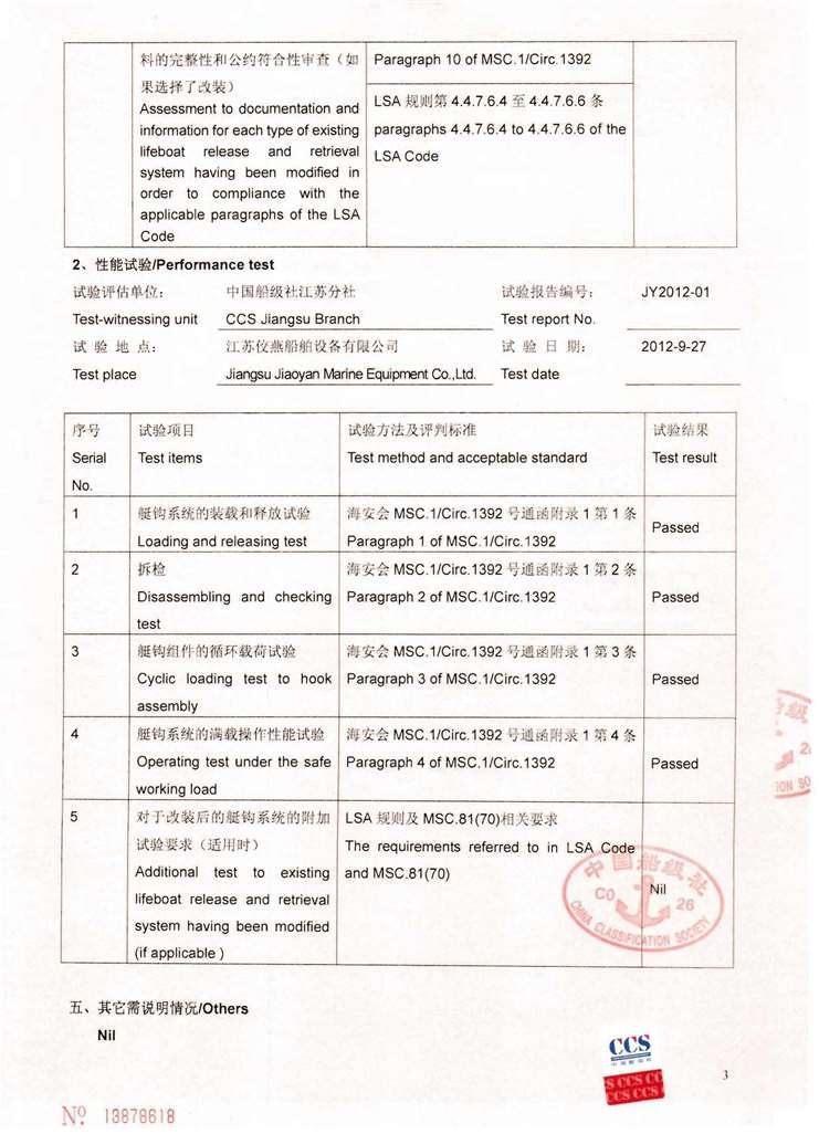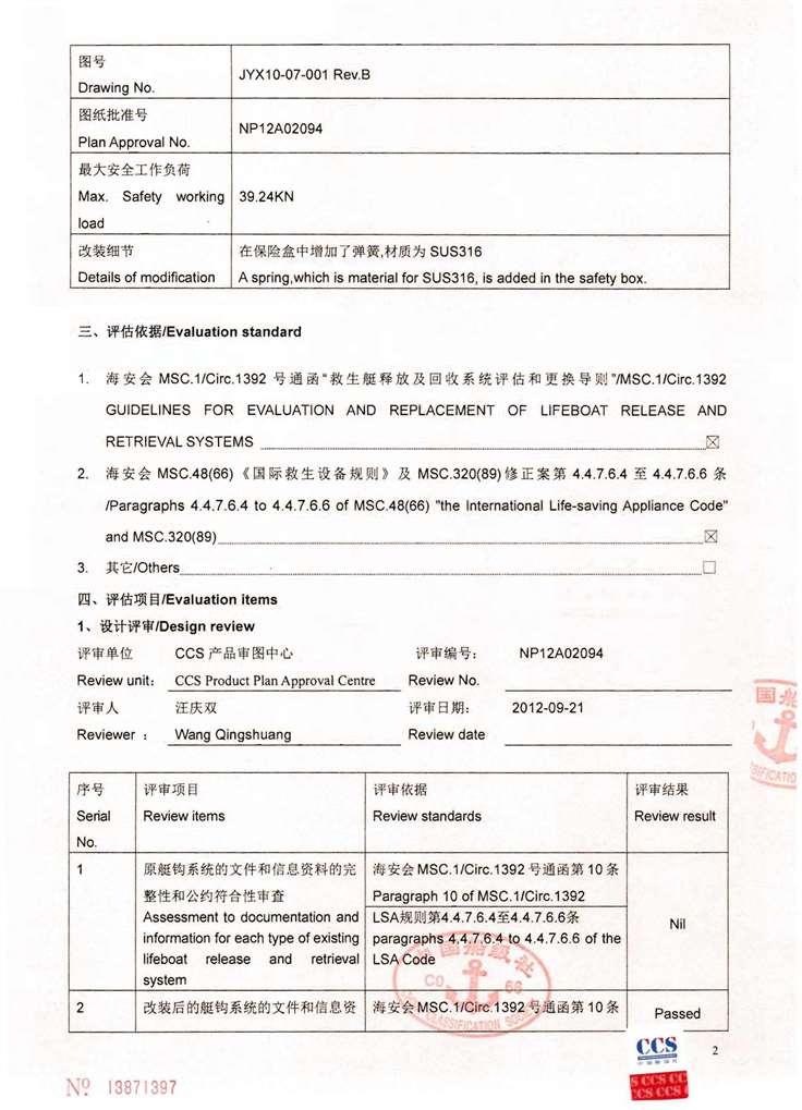 附录1:CCS船级社对现有艇钩系统的评估报告 示例1