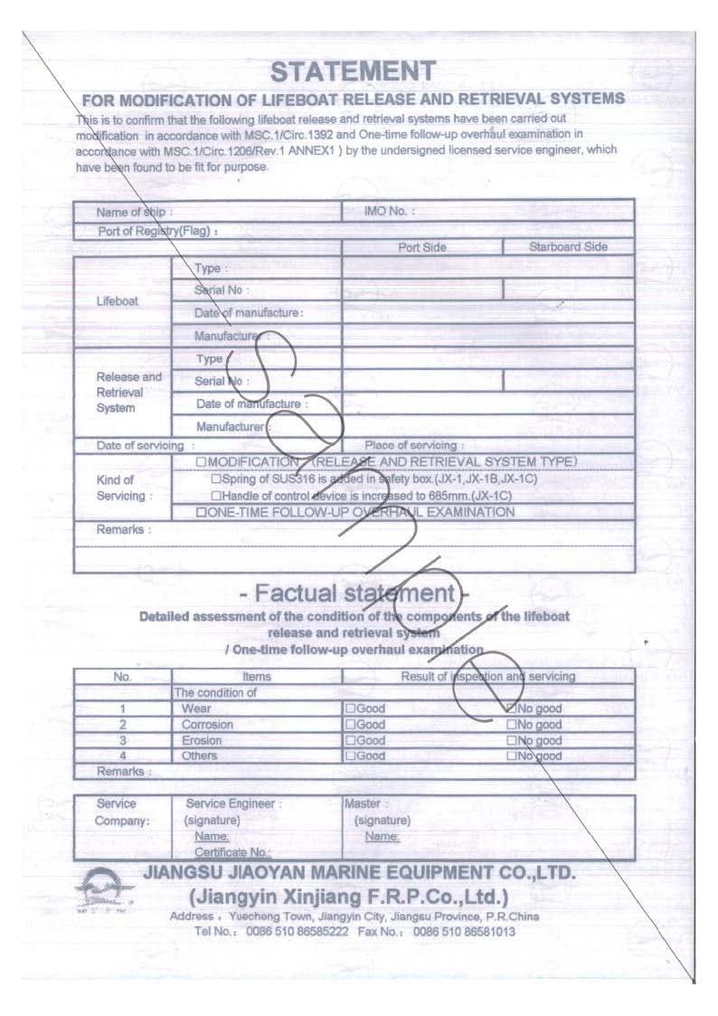近期,发现国内存在一些服务公司为牟取私利,置船员生命安全于不顾,未经我公司专业培训和认可,擅自对我公司(乐玩在线登录官网/江阴新江玻璃钢有限公司)生产的救生艇设备进行救生艇吊钩改造,同时签发伪造的声明,因此引起了重大的安全事故.重要提示:乐玩在线登录官网(江阴新江玻璃钢有限公司)对一切未经本公司专业培训和认可的服务商提供的对本公司产品的所有服务不承担任何责任,并保留对其追究法律责任的权利.